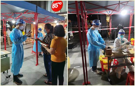 由于陳炯龍、陳英東兩位此前都有過負(fù)責(zé)核酸檢測掃碼工作的經(jīng)驗,在志愿服務(wù)崗前培訓(xùn)會議上,他們主動提出要承接這項亟需專注力和耐心的工作。陳炯龍為老人家仔細(xì)核對姓名、身份證號,耐心解釋工作流程,獲得老人一致好評。當(dāng)醫(yī)護(hù)組上缺少志愿者時,陳英東又化身為核酸檢測樣管“護(hù)送人”,認(rèn)真核對核酸樣管數(shù)量及檢測人數(shù),及時準(zhǔn)確地報送給醫(yī)護(hù)組……他們像陀螺一樣從晚上8點開始連軸轉(zhuǎn)忙碌到半夜12點多才結(jié)束任務(wù)回家。